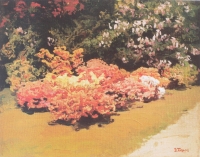 Jan PŁASKOCIŃSKI,W ogrodzie, 1958 , olej, tektura, 36 x 48 cm