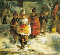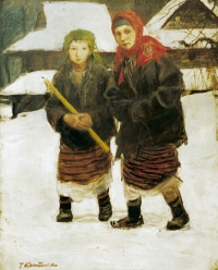 Malarz nieznany ,Kolędnicy , olej, płótno, 90 x 95 cm