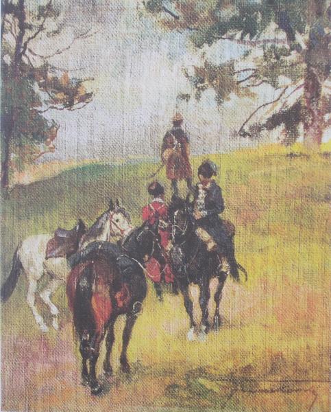 Antoni TRZESZCZKOWSKI ,Konfederaci barscy na zwiadzie, około 1930 , olej, płótno naklejone na tekturę, 22,5 x 18,3 cm
