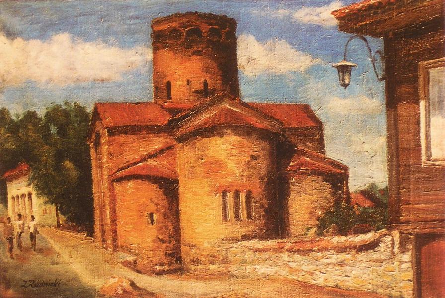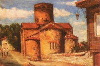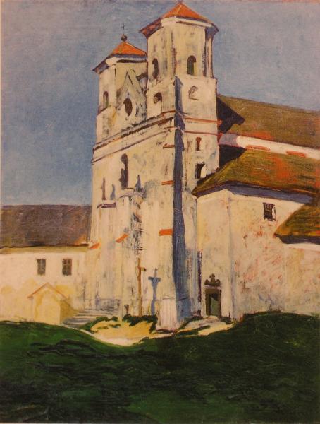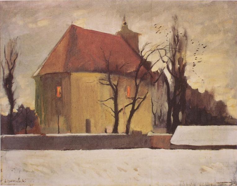 Stanisław KARNIEWSKI ,Widok kościoła o zmierzchu, około 1930 , olej, płótno naklejone na tekturę, 45 x 57 cm