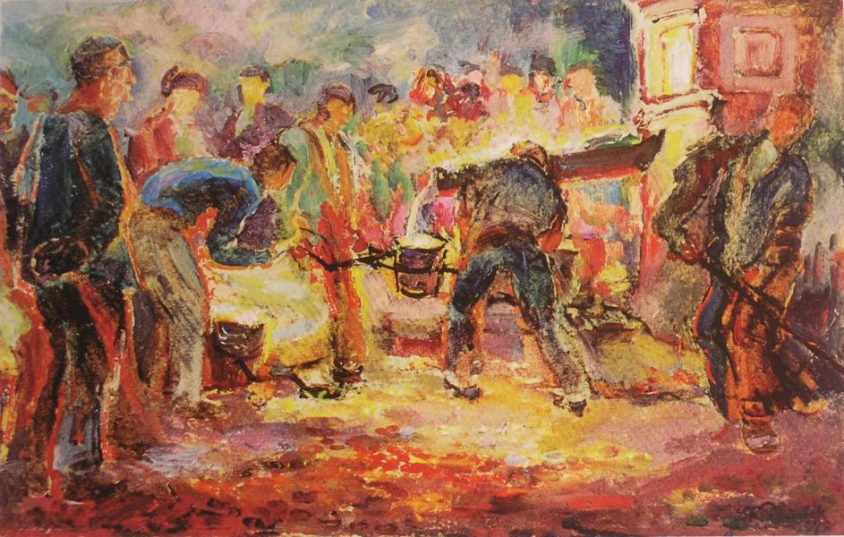 Stanisław PACIOREK ,W odlewni, 1942 , olej, tektura, 20 x 31 cm