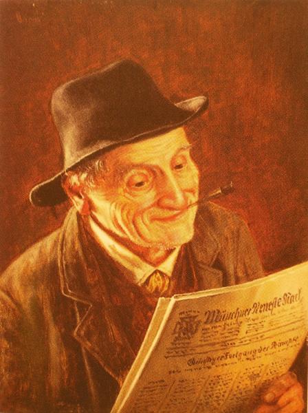 Oscar SCHMITT ,Starszy człowiek czytający prasę , olej, deska, 18 x 13,8 cm