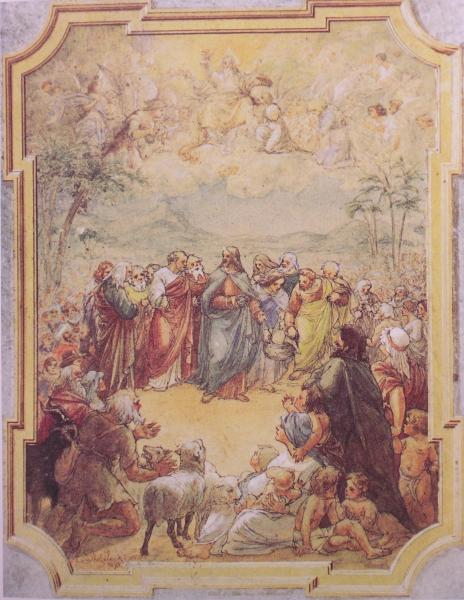 Jan Michał STRZAŁECKI ,Cudowne rozmnożenie chleba - projekt fresku, 1907 , tusz, akwarela, pastel, olej, papier, 42,5 x 31,5 cm