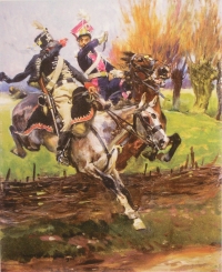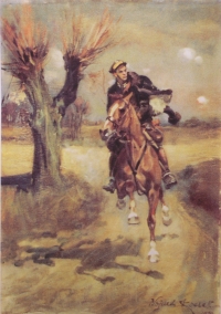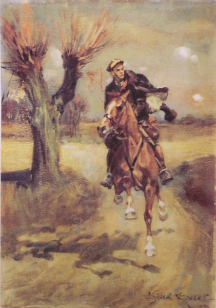 Wojciech KOSSAK ,Szwoleżer polski w starciu z pruskim huzarem (z I pułku leibhuzarów), 1914 , olej, deska, 60 x 50 cm