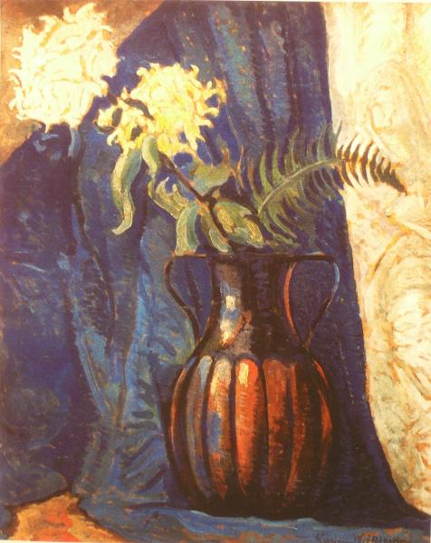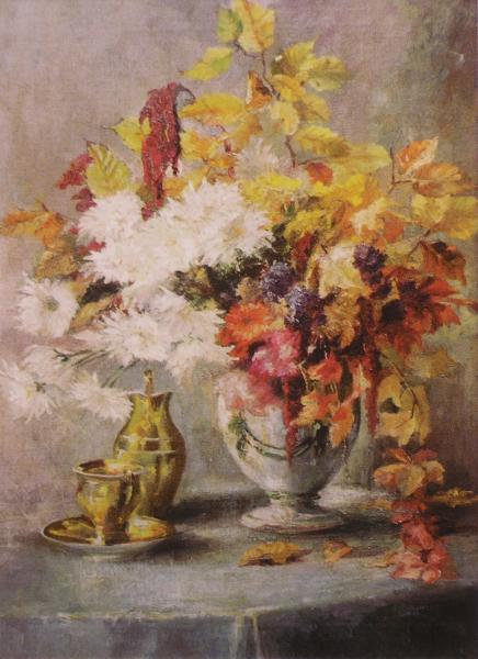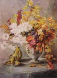 Wilhelmine MELZER ,Martwa natura z chryzantemami i suchymi liśćmi w wazonie , olej, płótno, 74,5 x 54 cm
