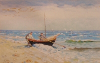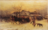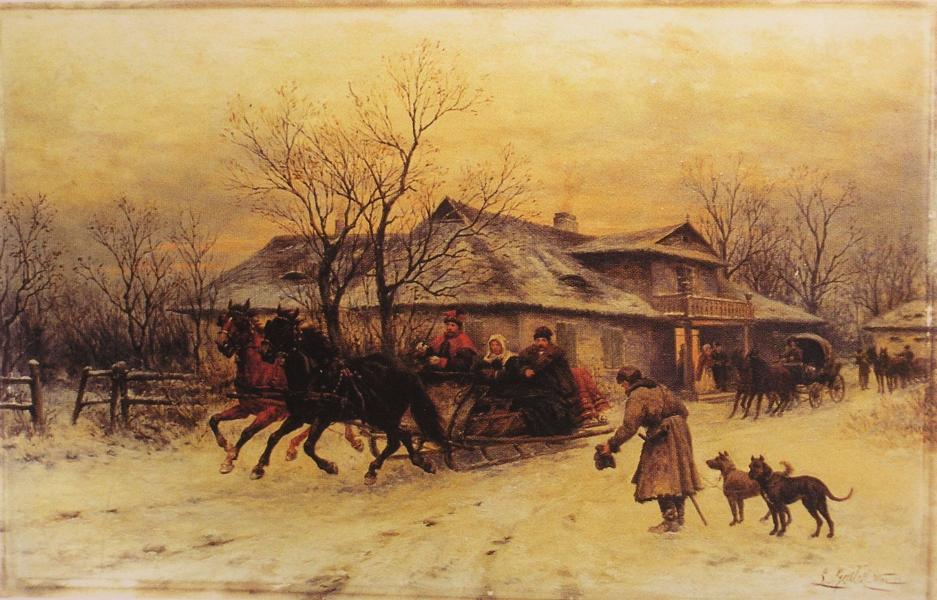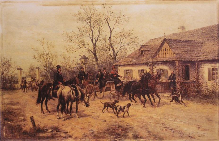 Ludwik GĘDŁEK ,Wyjazd gości, około 1880 , olej, deska, 37 x 58 cm