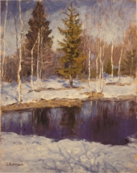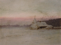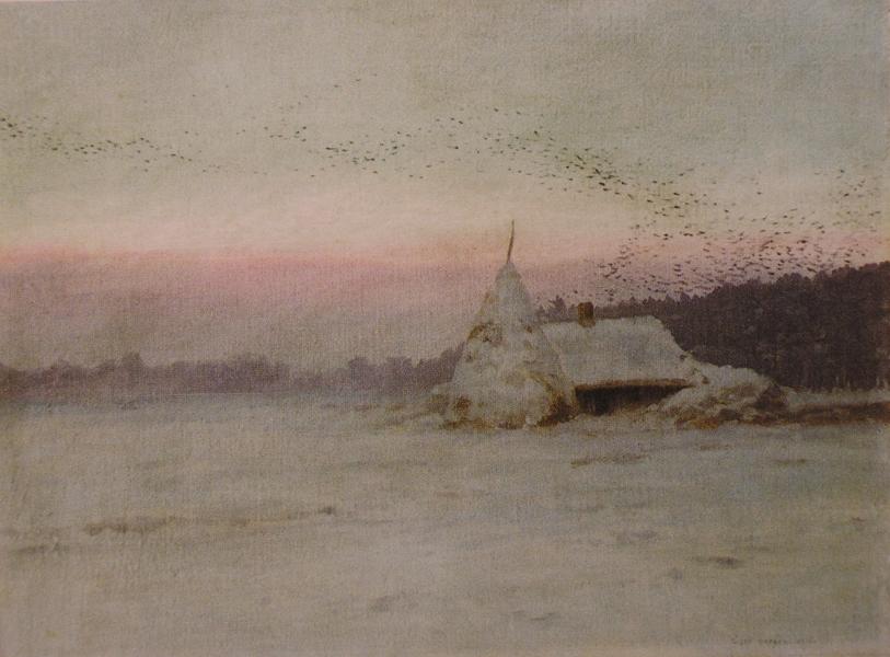 Józef RAPACKI ,Pejzaż zimowy - przelot ptaków przed zachodem słońca, 1916 , olej, płótno naklejone na tekturę, 47 x 62 cm