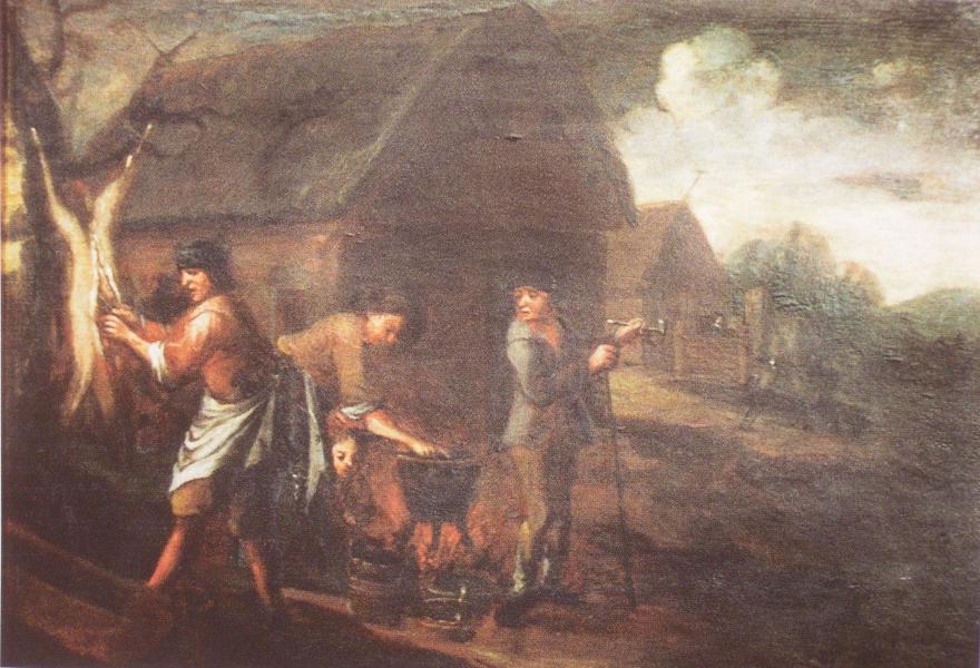 Malarz holenderski ,Świniobicie, około 1700 , olej, deska, 27 x 41 cm