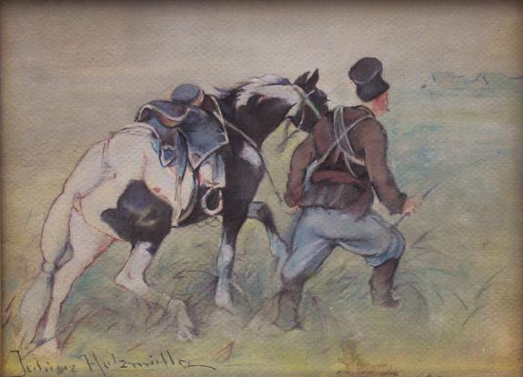 Juliusz Holzmüller w latach 1897 – 1901 studiował w Akademii Sztuk Pięknych w Krakowie w pracowni E. Cynka, J. Mehoffera i T. Axentowicza, a w latach 1903 – 1904 w Monachium. Najczęściej malował w technice akwareli, posługiwał się także sepią i tuszem. Ulubionymi tematami artysty były pejzaże oraz sceny rodzajowe z motywem koni. Zasłynął jako malarz wykonujący szkice batalistyczne z udziałem konnicy japońskiej w akcji. Wystawiał między innymi w Towarzystwie Przyjaciół Sztuk Pięknych w Krakowie, we Lwowie i Towarzystwie Zachęty Sztuk Pięknych w Warszawie.