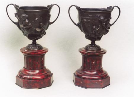 Para wazek dekoracyjnych z motywem centaurów, Francja początek XIX wieku , brąz patynowany, czerwony marmur, wysokość 25,5 cm, średnica 12,5 cm