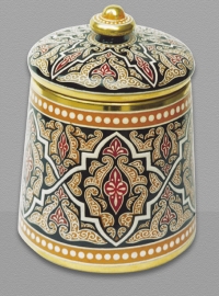 Pojemnik z przykrywką dekorowany w motywy arabeskowe, Francja, około 1880 - 1890 , szkło mleczne, z dekoracją emaliową na powierzchni, wysokość 15,5 cm (z przykrywką), średnica 13 cm