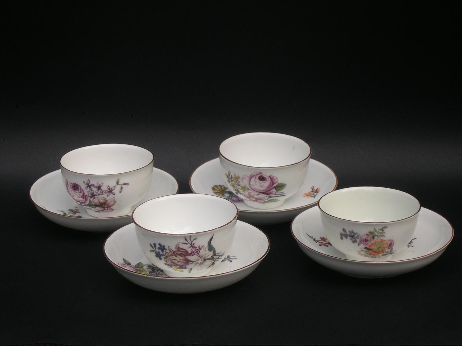 Czarki porcelanowe z podstawkami dekorowane motywem kwiatowym, Miśnia, lata 1745 – 1750, 4 sztuki